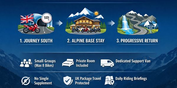 Alpine Roads provides guided touring routes and logistical coordination. Riders remain fully responsible for their own riding, road positioning, speed and compliance with local traffic laws.